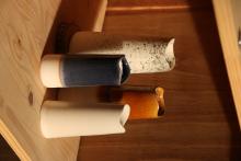 Rectiligne et discret, le vase Sage en grès blanc structure la décoration par ses lignes, et permet un visuel graphique minimaliste quand il est multiplié dans l’espace.